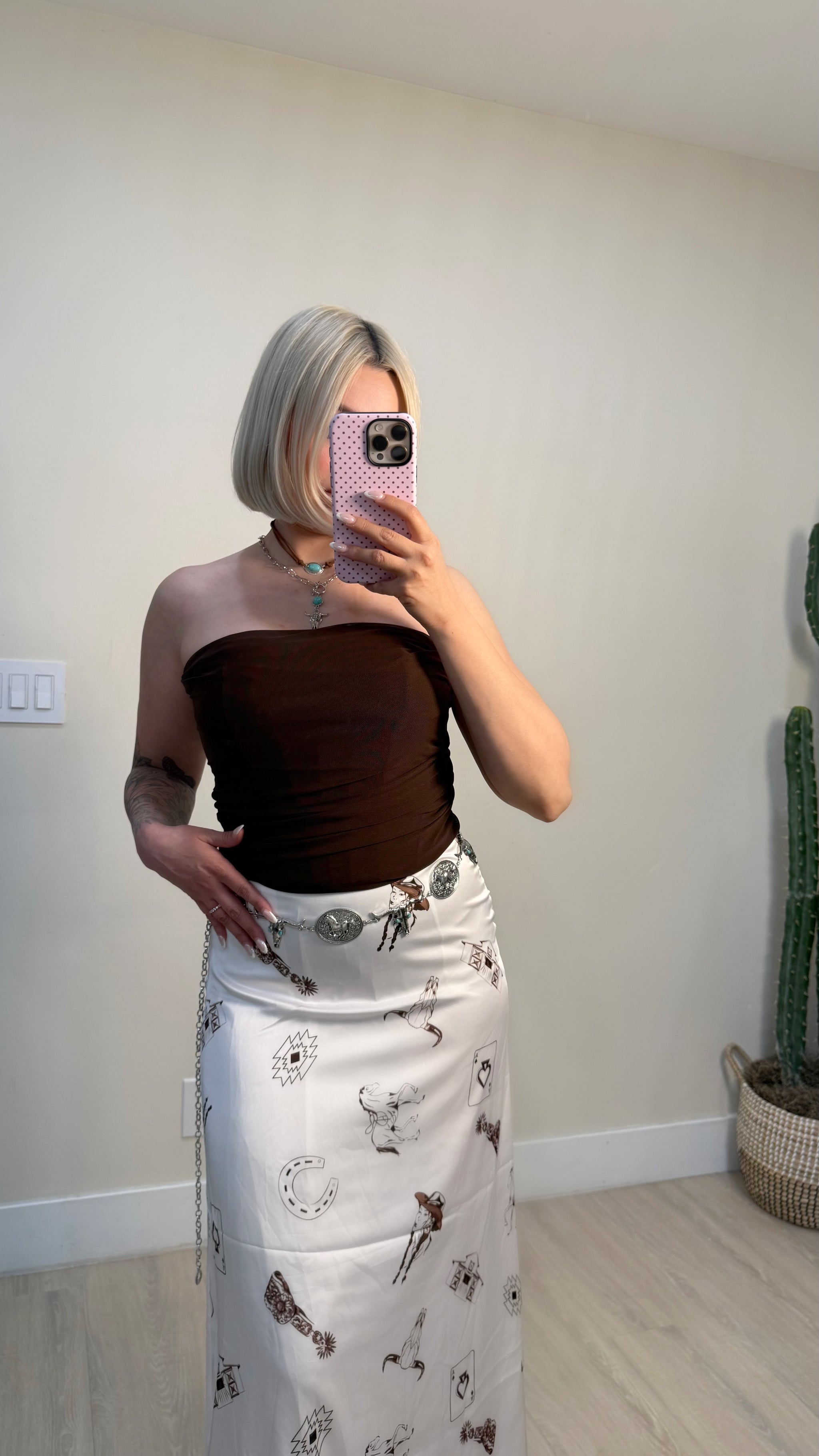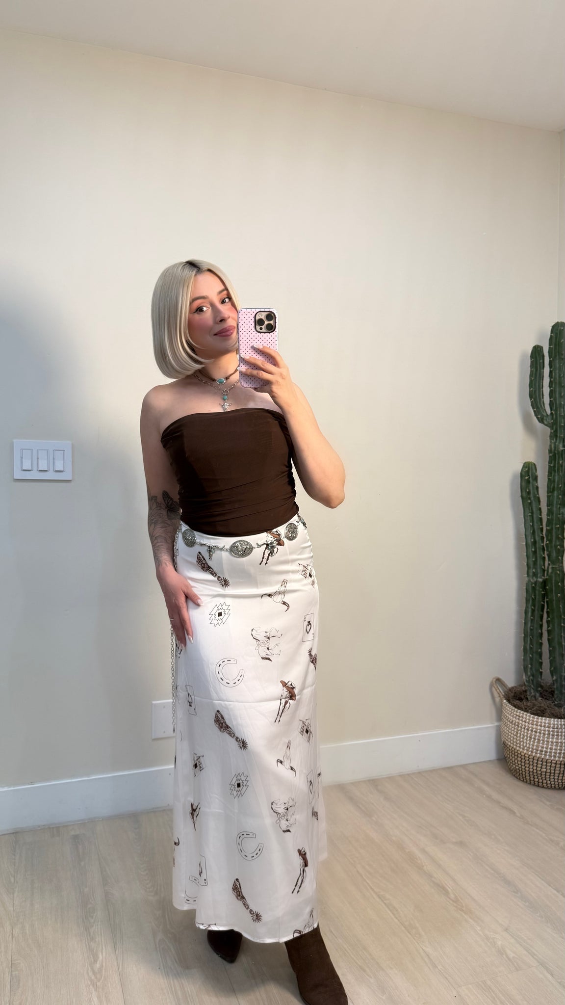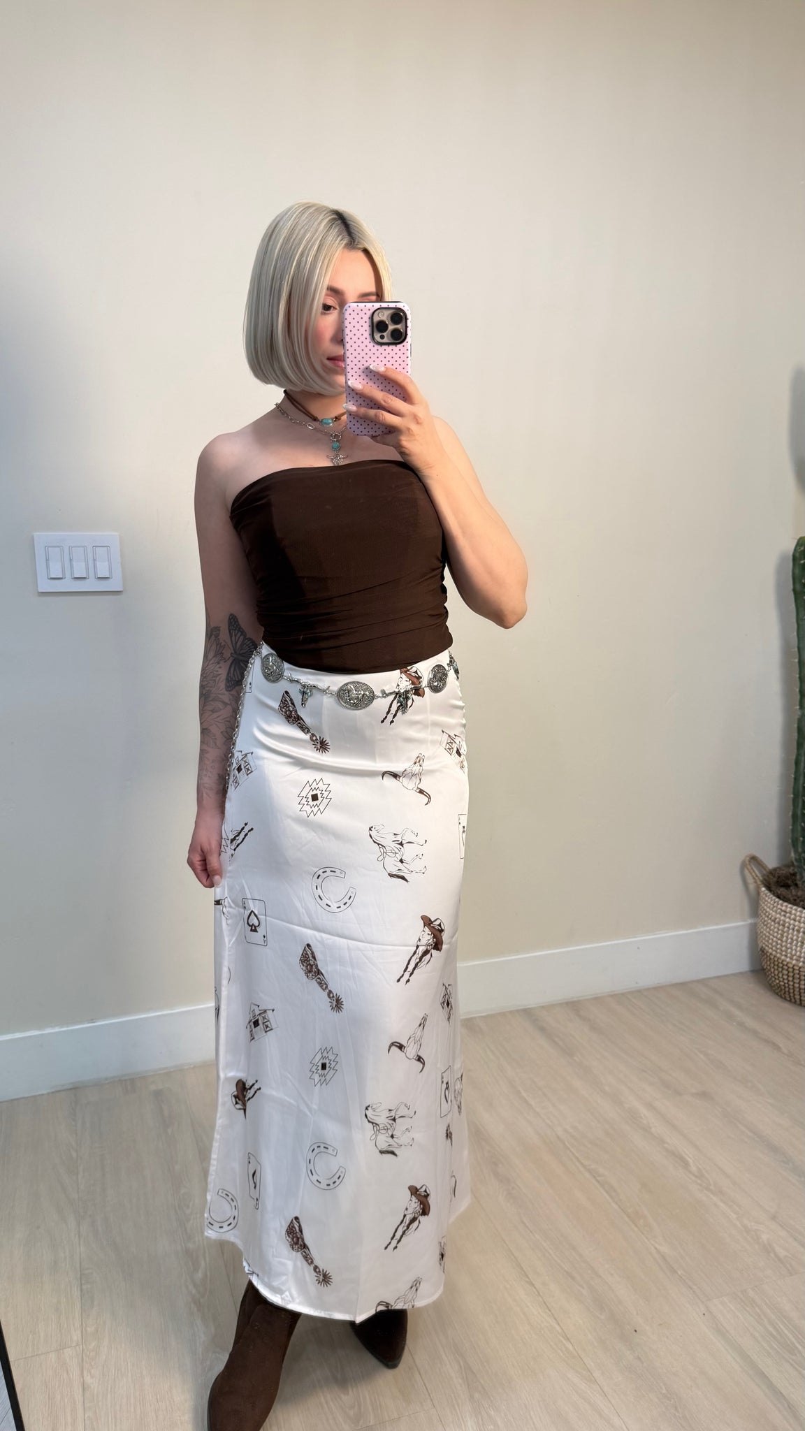 La Hacienda Maxi is a stunning fusion of Mexican heritage and modern boutique style. Featuring an elegant all-over print of classic Charrería symbols—horseshoes, saddles, and riders—this skirt captures the soul of the ranch in a sophisticated "toile" aesthetic.